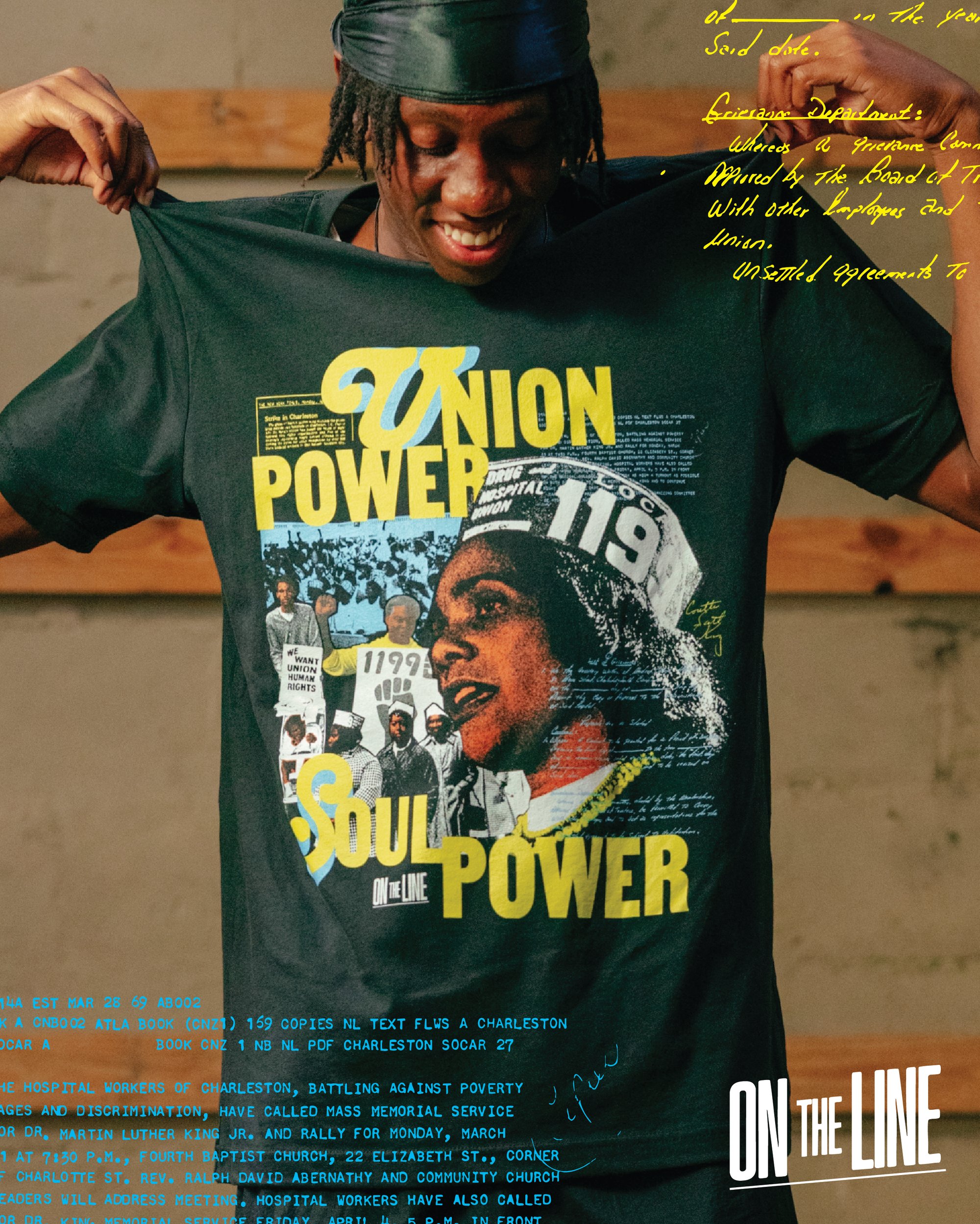 In 1969, hundreds of Black healthcare workers walked out on strike for their rights inside and outside of the workplace. The workers' powerful slogan of "Union Power / Soul Power" reflected the merging of the labor movement and the Black freedom struggle into one powerful force fighting for justice and dignity. Facing off against a racist state government, workers defied firebombings, National Guard deployments, and mass arrests. The workers were out on strike for 113 days and with the support of prominent Civil Rights activists like Coretta Scott King, featured here in the shirt, they secured significant victories.