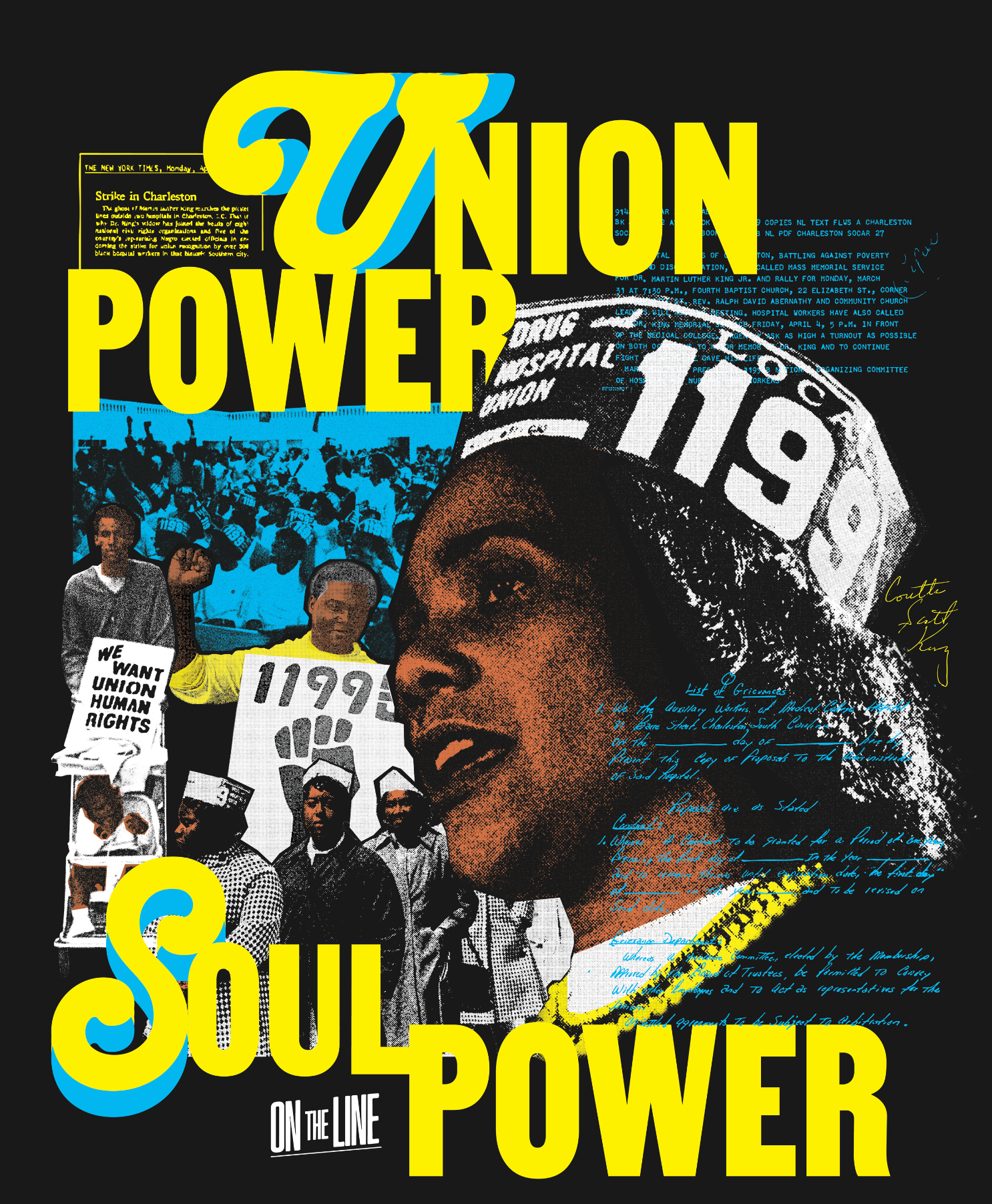 In 1969, hundreds of Black healthcare workers walked out on strike for their rights inside and outside of the workplace. The workers' powerful slogan of "Union Power / Soul Power" reflected the merging of the labor movement and the Black freedom struggle into one powerful force fighting for justice and dignity. Facing off against a racist state government, workers defied firebombings, National Guard deployments, and mass arrests. The workers were out on strike for 113 days and with the support of prominent Civil Rights activists like Coretta Scott King, featured here in the poster, they secured significant victories.
